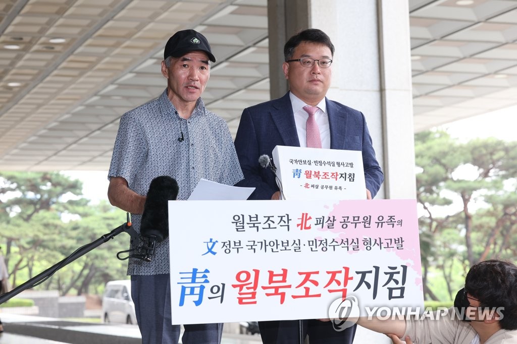 | ▲ Lee Rae-jin (L), the elder brother of a South Korean official shot to death by North Korean soldiers while drifting in waters in the West Sea in September 2020, and his lawyer, Kim Ki-yoon, hold a news conference in front of the Seoul Central Prosecutors Office in Seoul on June 22, 2022, prior to filing a complaint against three presidential secretaries of the former Moon Jae-in government for pressuring the Coast Guard and the defense ministry two years ago to publicly state that the official is believed to have been killed while trying to defect to North Korea. The three are former National Security Adviser Suh Hoon, former senior presidential civil affairs secretary Kim Jong-ho and former civil affairs secretary Lee Kwang-cheol. (Yonhap) |