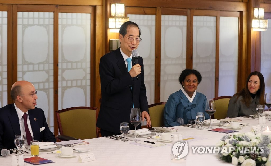 | ▲ Prime Minister Han Duck-soo (2nd from L) speaks at a meeting with the ambassadors from nine countries on Feb. 9, 2023, in this photo provided by the prime minister's office. (PHOTO NOT FOR SALE) (Yonhap) |