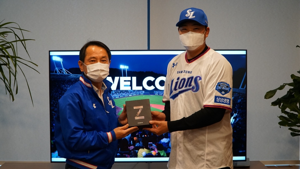| ▲ 새 식구 오재일에게 갤럭시Z 폴드2 선물하는 원기찬 삼성 라이온즈 대표 [삼성 라이온즈 제공. 재판매 및 DB 금지] |