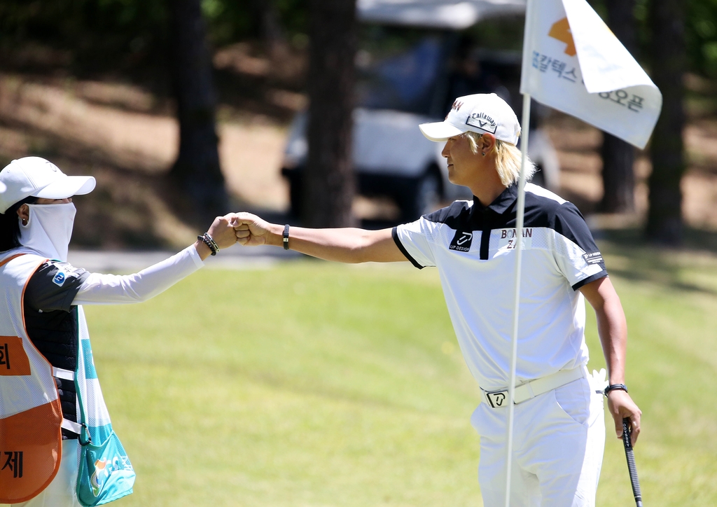 | ▲ 버디를 잡고 캐디를 맡은 아내와 주먹을 마주치는 허인회. [GS칼텍스 매경오픈 조직위 제공. 재판매 및 DB 금지] |