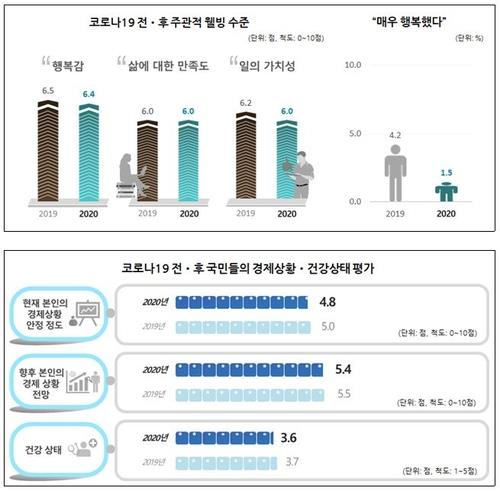 | ▲ This image, provided by the Korea Institute of Public Administration on Feb. 23, 2021, shows that South Koreans' average level of happiness was 6.4 points on a 10-point scale last year, down 0.1 point from the previous year due to the new coronavirus pandemic. (PHOTO NOT FOR SALE) (Yonhap) |