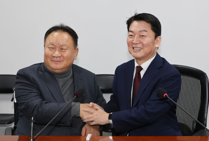 Independent lawmaker Lee Sang-min (L), who has bolted from the main opposition Democratic Party, shakes hands with Ahn Cheol-soo, a lawmaker of the ruling People Power Party and a former presidential candidate, during their meeting at the National Assembly in Seoul on Dec. 15, 2023. (Yonhap)