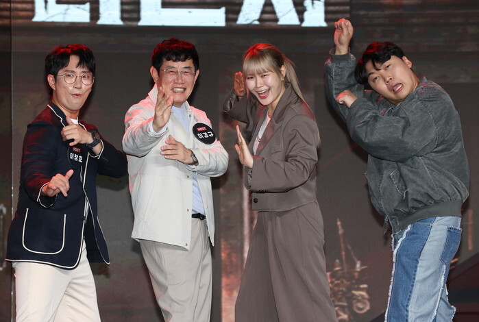 The stars of the Netflix show "Comedy Revenge" -- Lee Chang-ho, Lee Kyung-kyu, Um Ji-yoon and Jo Hoon (L to R) -- pose for a photo during a publicity event in Seoul on Oct. 14, 2024. The reality show will be released worldwide on Oct. 15. (Yonhap)