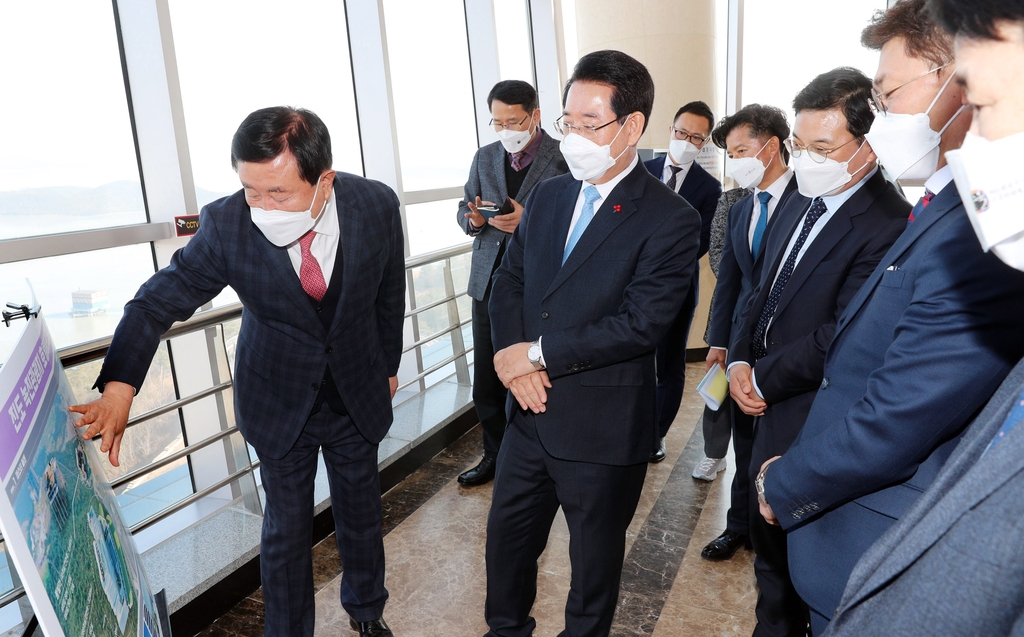 | ▲ 녹진관광지 호텔 조감도 살펴보는 김영록 전남지사 [전남도 제공] |