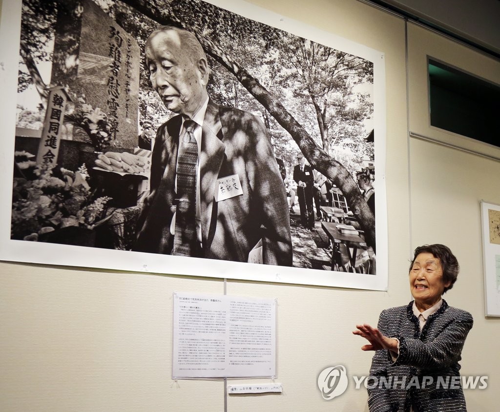| ▲ 고 이학래 씨 부인 강복순 여사 (도쿄=연합뉴스) 이세원 특파원 = 22일 오후 일본 도쿄도(東京都)의 한 시설에서 열린 이학래(1925∼2021) 씨 추도 사진전에서 이씨의 부인 강복순(86) 여사가 남편의 사진을 배경으로 사진 촬영에 응하고 있다. 일제 강점기에 일본군 포로 감시원으로 동원된 이씨는 일본이 패전한 후 BC급 전범으로 처벌받았다. 이씨는 한국인 BC급 전범의 명예 회복과 일본 정부의 보상을 요구하며 수십 년간 투쟁했으나 생전에 뜻을 이루지 못하고 올해 3월 28일 별세했다. 2021.11.22 sewonlee@yna.co.kr |