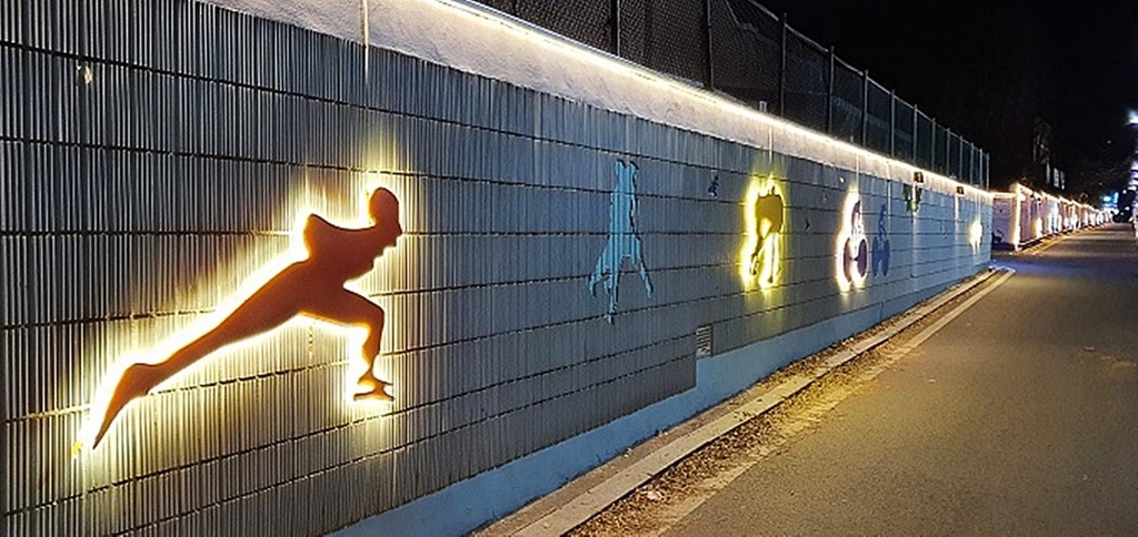 (의정부=연합뉴스) 김도윤 기자 = 경기 의정부시가 가능동 중학교에서 고등학교로 이어지는 담장 200m 구간에 벽화 조명을 설치해 눈길을 끌고 있다.