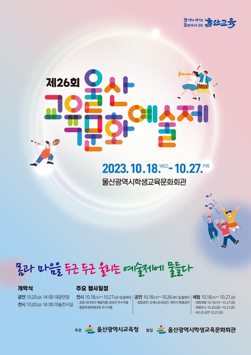 (울산=연합뉴스) 김용태 기자 = 울산시교육청은 18일부터 27일까지 울산학생교육문화회관에서 제26회 울산교육문화예술제를 개최한다고 17일 밝혔다.