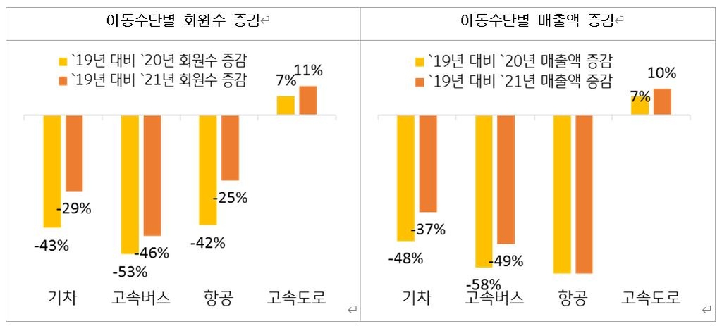 2019년 추석 기간 대비 기차 이용 KB카드 회원 수는 2020년 43%, 2021년 29% 각각 급감했고, 고속버스 이용 회원도 2020년 53%, 2021년 46% 줄었다. 항공 이용 회원은 2019년 추석 기간과 비교해 2020년 42%, 2021년 25% 각각 줄었다.