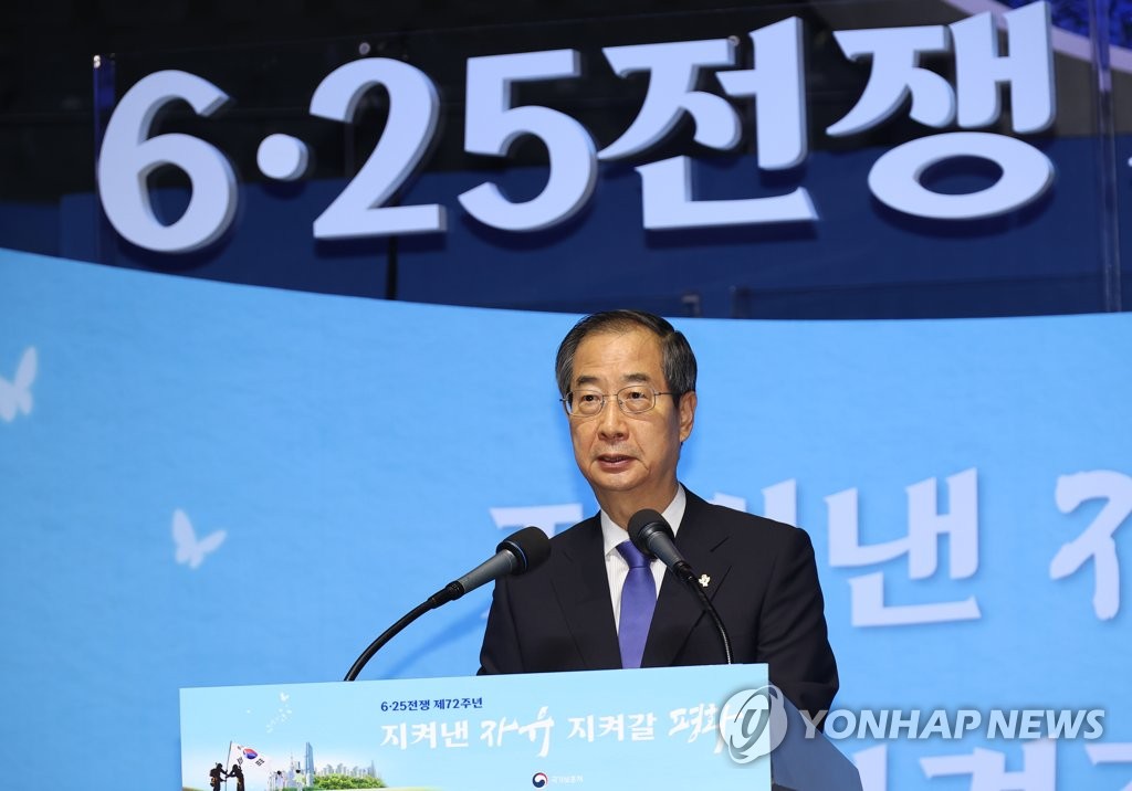 | ▲ Prime Minister Han Duck-soo delivers a speech during a ceremony to mark the 72nd anniversary of the outbreak of the 1950-53 Korean War in Seoul on June 25, 2022. (Yonhap) |