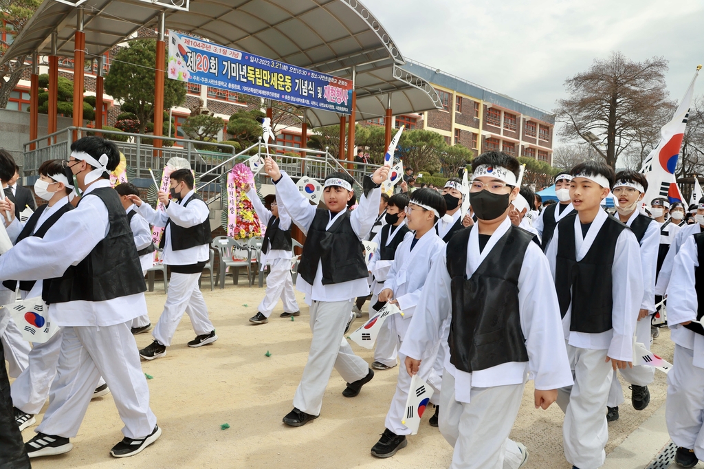 (사천=연합뉴스) 지성호 기자 = 경남 사천초등학교 학생들과 사천시민들이 21일 교내 운동장 일원에서 기미년 독립만세운동 재현행사를 펼쳤다.