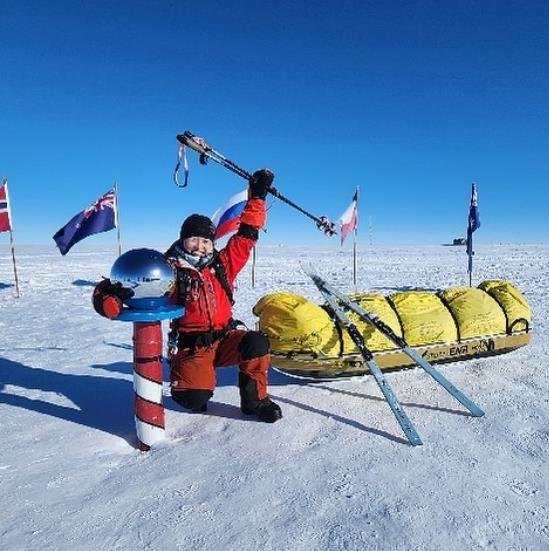 김영미 대장은 지난해 11월 27일(이하 현지시간) 칠레 허큘리스 인렛을 출발해 51일간 식량의 재보급 없이 홀로 113㎏의 썰매를 끌며 1천186.5㎞를 걸어 이달 16일 남극점에 도달했다.