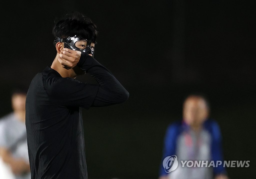 | ▲ 마스크 만지는 손흥민 (도하=연합뉴스) 임헌정 기자 = 2022 카타르 월드컵 대한민국 축구 대표팀의 '캡틴' 손흥민이 19일 오후(현지시간) 카타르 도하의 알에글라 훈련장에서 훈련하던 중 마스크를 만지고 있다. 2022.11.20 kane@yna.co.kr |