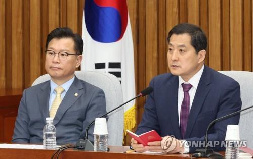 | ▲ The ruling People Power Party's chief policy maker, Park Dae-chul (R), speaks at a party meeting held at the National Assembly in Seoul on May 19, 2023. (Yonhap) |