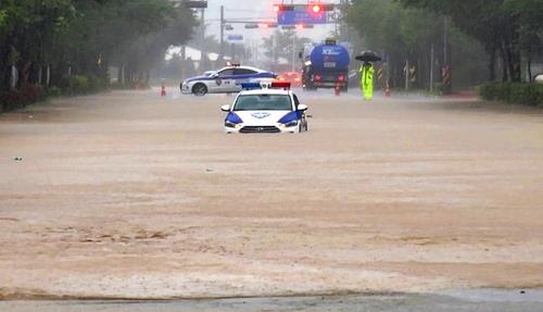| ▲ This photo provided by a reader shows a police car submerged in rainwater in the southern city of Gunsan on July 14, 2023. (PHOTO NOT FOR SALE) (Yonhap) |