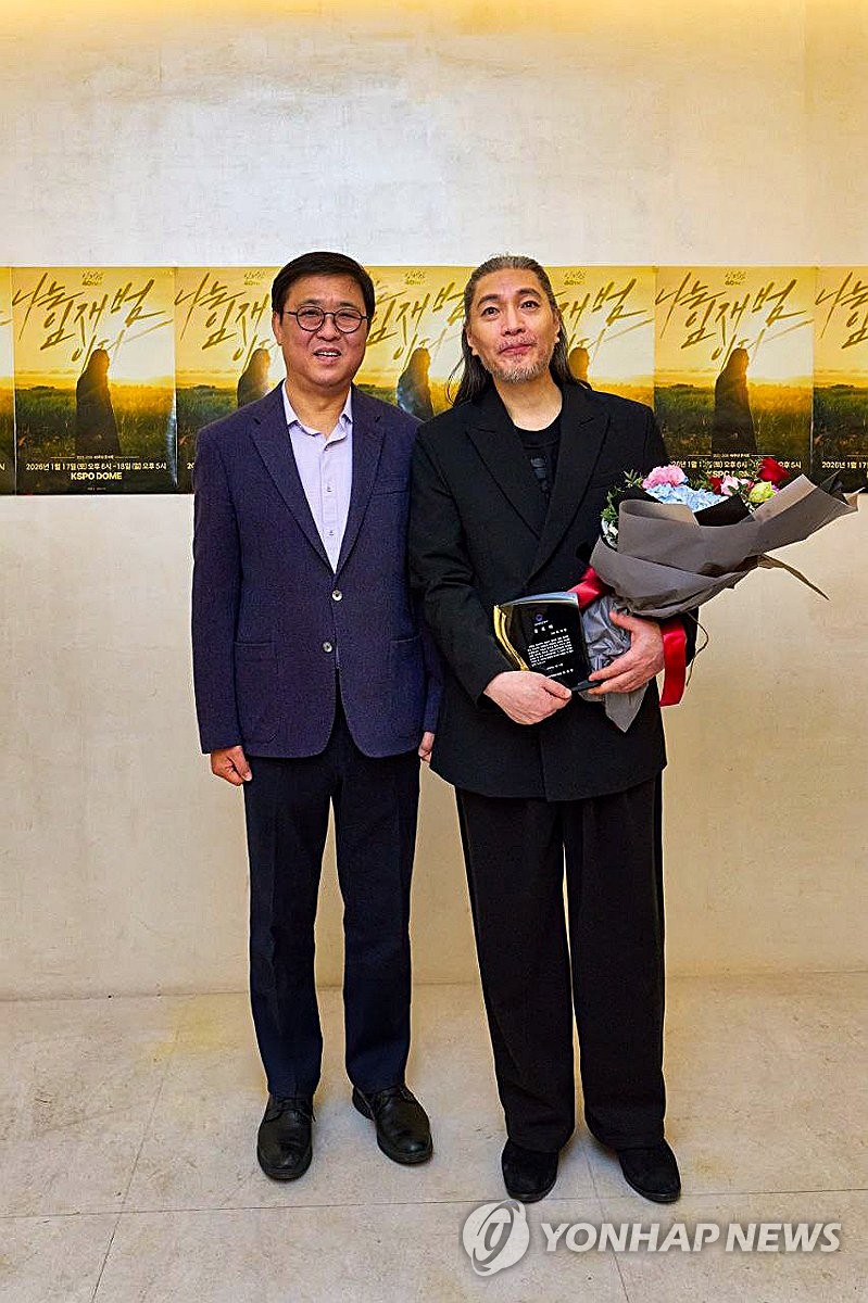 | ▲ 최휘영 문화체육관광부 장관, 임재범에게 공로패 수여 (서울=연합뉴스) 최휘영 문화체육관광부 장관이 지난 17일 서울 송파구 올림픽공원 케이스포돔에서 '2025-26 임재범 40주년 콘서트 나는 임재범이다' 현장을 찾아 40년간의 가수 생활을 마무리하는 가수 임재범에게 공로패를 수여하고 있다. 2026.1.18 [문화체육관광부 제공. 재판매 및 DB 금지] photo@yna.co.kr |
