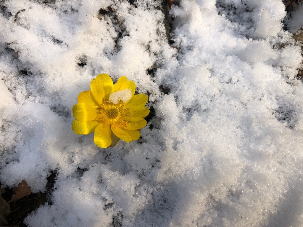 복과 장수를 상징하는 복수초는 하얀 눈 속에서 꽃을 피워 얼음새꽃, 설연화, 눈색이꽃 등으로도 불린다.