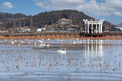 전남 무안군(군수 김산)은 동양 최대의 백련 자생지인 무안 회산백련지에 새해부터 큰고니 150여 마리가 월동해 장관을 이루고 있다고 밝혔다.