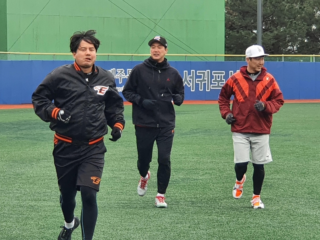 | ▲ 런닝하는 김광현과 정우람, 임준섭 (서귀포=연합뉴스) 하남직 기자 = 김광현(가운데)과 정우람(오른쪽), 임준섭이 21일 제주도 서귀포시 강창학야구장에서 런닝을 하고 있다. |