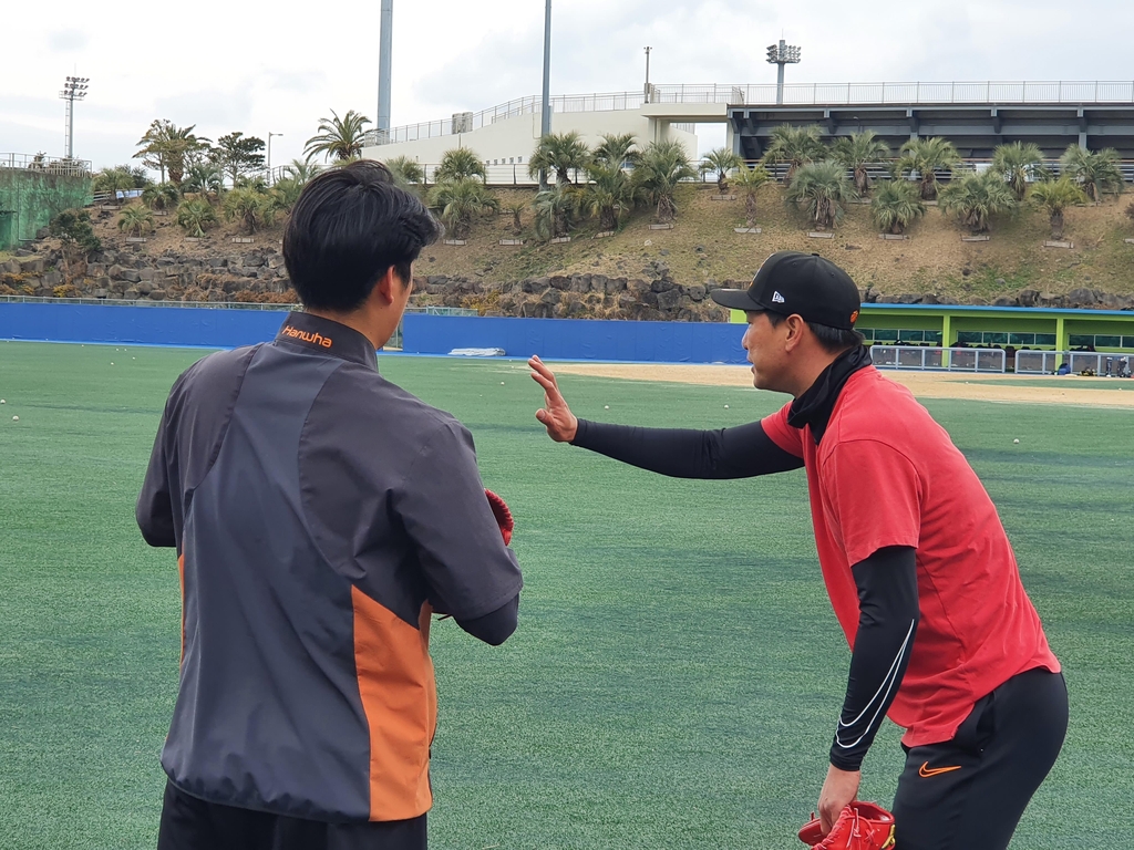(서귀포=연합뉴스) 하남직 기자 = 미국프로야구 메이저리그 자유계약선수(FA) 김광현(34)의 공을 받은 김이환(22·한화 이글스)이 글러브와 공이 내는 마찰음과 동시에 감탄사를 내뱉었다.