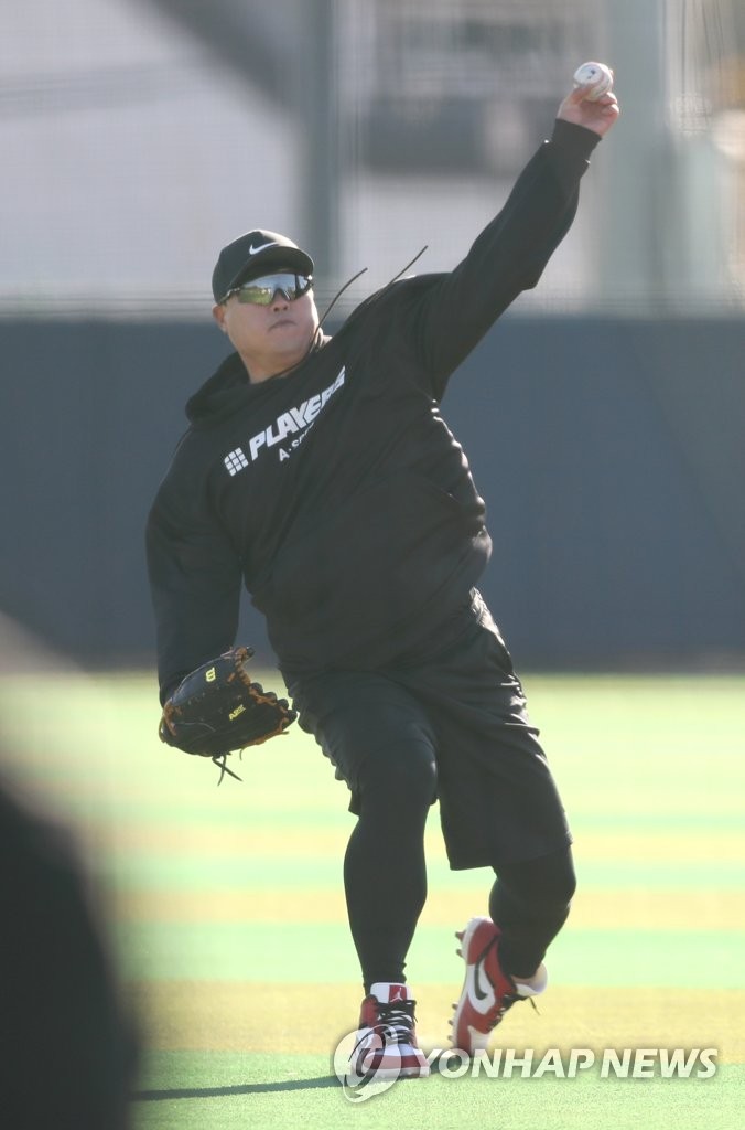 | ▲ 국내에서 몸 푸는 류현진 (거제도=연합뉴스) 김동민 기자 = 류현진(35·토론토 블루제이스) 선수가 3일 오후 경남 거제시 하청스포츠타운에서 국내 친정팀인 한화 이글스와 훈련하고 있다. 류현진의 캐치볼 파트너는 로사도 코치였다. 2022.2.3 image@yna.co.kr |