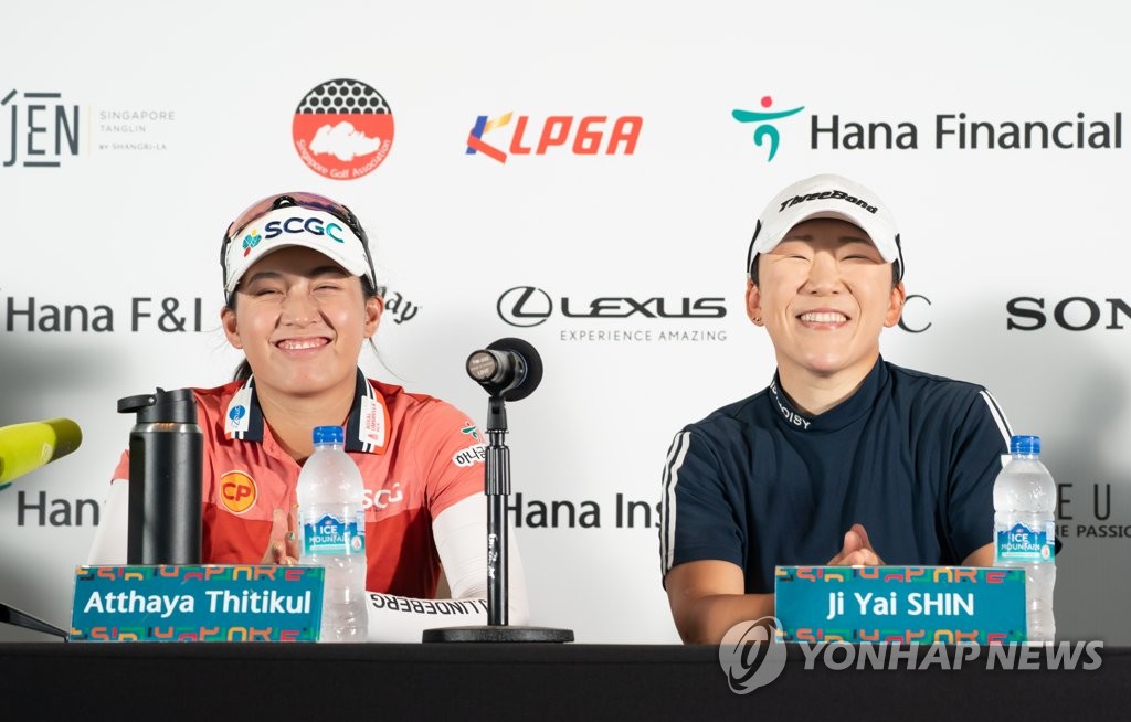 | ▲ 기자회견 하는 티띠꾼과 신지애 (서울=연합뉴스) 신지애(오른쪽)와 아타야 티띠꾼이 7일 싱가포르에 위치한 타나메라 컨트리 클럽 템피니스 코스에서 열릴 '하나금융그룹 싱가포르 여자오픈' 공식 기자회견에 참석하고 있다. 2022.12.7 [하나금융그룹 싱가포르 여자오픈 대회 조직위원회 제공. 재판매 및 DB 금지] photo@yna.co.kr |