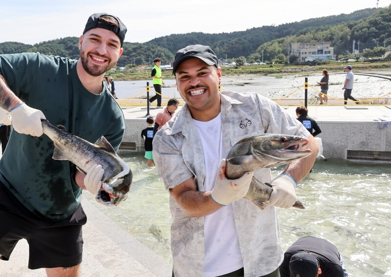 | ▲ 연어잡기 체험에 참가한 외국인 [양양군 제공.재판매 및 DB 금지] |