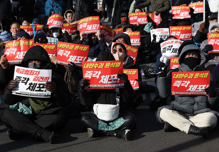 Protestors hold up a banner saying, "Detain Yoon Suk Yeol immediately," as they join a rally near the entrance of impeached President Yoon Suk Yeol's official residence in Seoul on Jan. 9, 2025, to call for the execution of a warrant to detain Yoon over his short-lived imposition of martial law. (Yonhap)