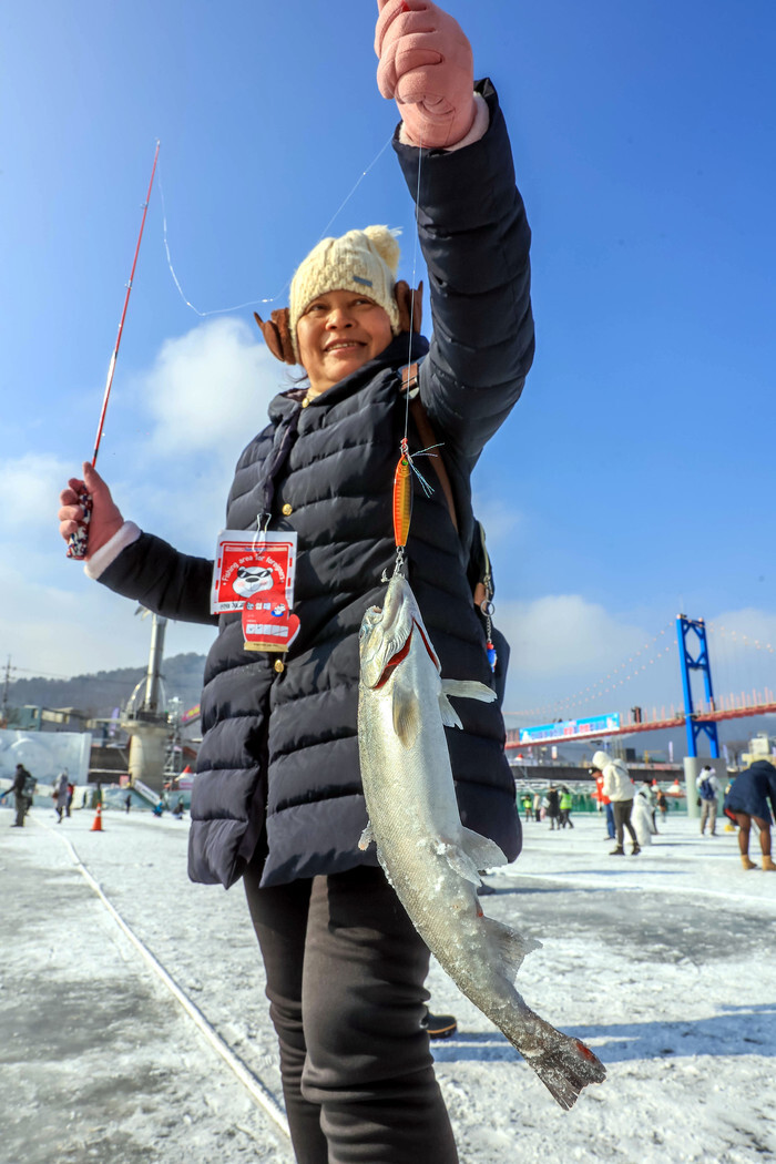 In this photo taken Jan. 18, 2025, and provided by Hwacheon county, a foreign visitor smiles after successfully hooking a masou salmon at the 2025 Hwacheon Sancheoneo Ice Festival, one of South Korea's most popular winter events, which kicked off on Jan. 11 and lasts through Feb. 2 in Hwacheon, Gangwon Province. (PHOTO NOT FOR SALE) (Yonhap)