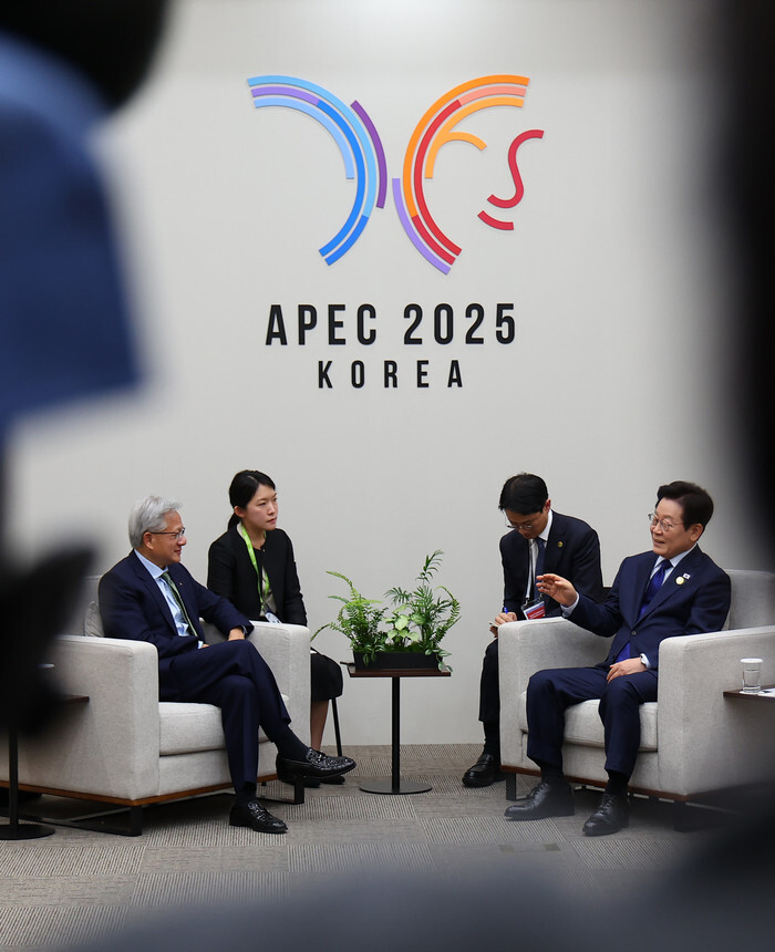 South Korean President Lee Jae Myung (R) meets with Nvidia CEO Jensen Huang at the Gyeongju Hwabaek International Convention Center, the main venue of the Asia-Pacific Economic Cooperation summit, on Oct. 31, 2025. (Yonhap)
