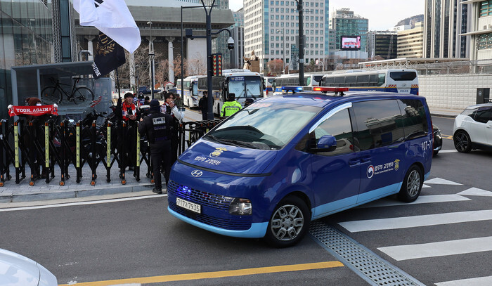 A justice ministry vehicle carrying jailed former first lady Kim Keon Hee enters the building housing the office of special counsel Min Joong-ki's team in Seoul on Dec. 4, 2025, a day after she attended the last hearing of her corruption trial following her indictment on charges of stock manipulation, bribery and other corruption. (Yonhap)