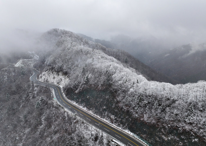 The Guryong Pass in Yangyang, Gangwon Province, is covered with snow on Nov. 25, 2025, amid a heavy snow advisory issued for the province's mountainous regions. (Yonhap)
