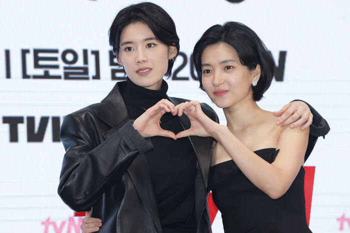 South Korean actresses Kim Tae-ri (R) and Jung Eun-chae, who star in the new drama "Jeongnyeon: The Star Is Born," pose for a photo during a publicity event in Seoul on Oct. 10, 2024. The first episode of the drama will be aired by the local cable TV network tvN on Oct. 12. (Yonhap)