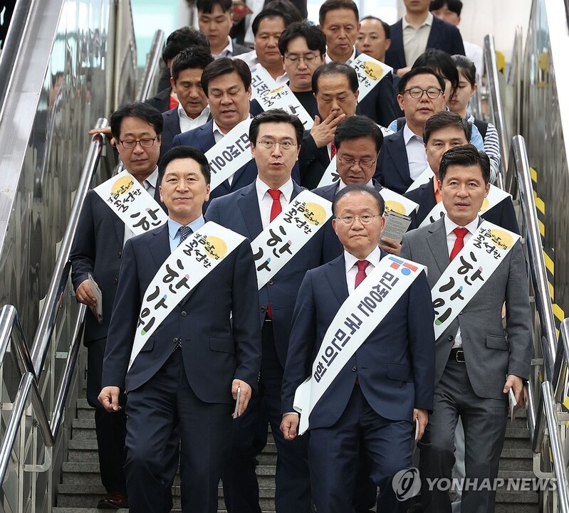 | ▲ 서울역 찾은 국민의힘 (서울=연합뉴스) 신준희 기자 = 국민의힘 김기현 대표와 윤재옥 원내대표 등 지도부가 27일 서울역에서 귀성길 시민들에게 인사하기 위해 걸어가고 있다. 2023.9.27 hama@yna.co.kr |