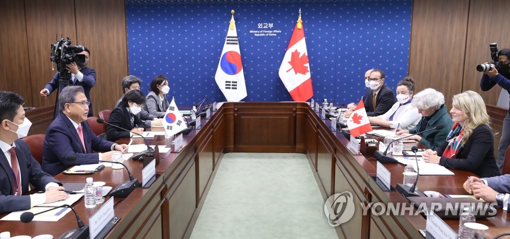 The meeting, which coincided with a visit by Canadian Prime Minister Justin Trudeau to South Korea later in the day for a summit with President Yoon Suk Yeol, was attended by Foreign Minister Park Jin, Trade Minister Ahn Duk-geun, Canadian Foreign Minister Melanie Joly and Francois-Philippe Champagne, Ottawa's innovation, science and industry minister.