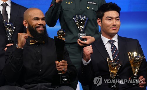 | ▲ 2015년 KBO 시상식에 참석한 테임즈(왼쪽) [연합뉴스 자료사진] |