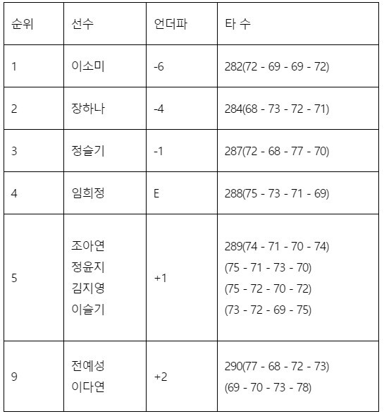 ◇ 한국여자프로골프(KLPGA)투어 롯데렌터카 여자오픈 최종순위