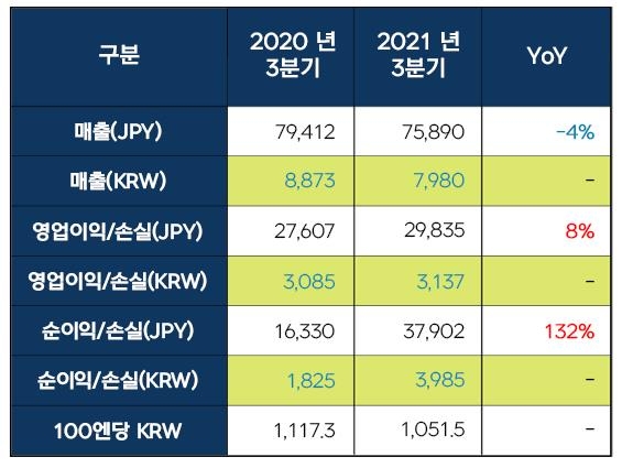 순이익은 3천985억 원(379억 엔)으로 132% 급증했다. 매출은 7천980억 원(759억 엔)으로 4% 감소했다.