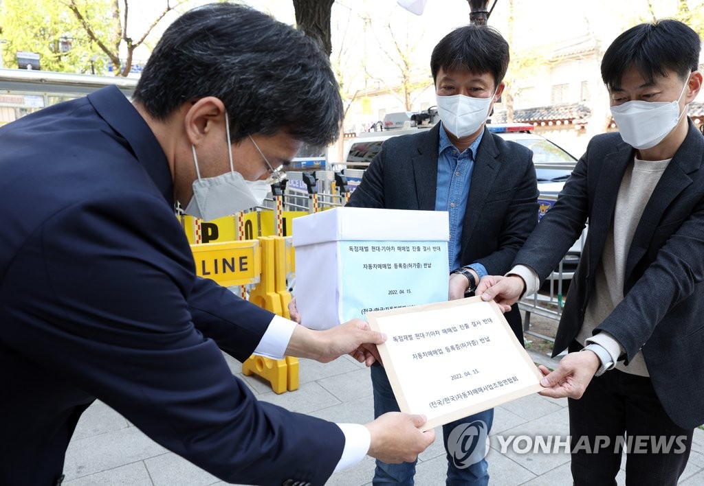 | ▲ '현대ㆍ기아차 중고차 매매업 진출 반대' (서울=연합뉴스) 이지은 기자 = 중고차 매매업자 단체인 전국자동차매매사업조합연합회와 한국자동차매매사업조합연합회 관계자들이 15일 오후 서울 종로구 통의동 대통령직 인수위원회 인근에서 현대ㆍ기아차의 중고차 매매업 진출을 반대하며 자동차매매업 등록증(허가증)을 인수위 측에 반납하는 퍼포먼스를 하고 있다. 2022.4.15 jieunlee@yna.co.kr |