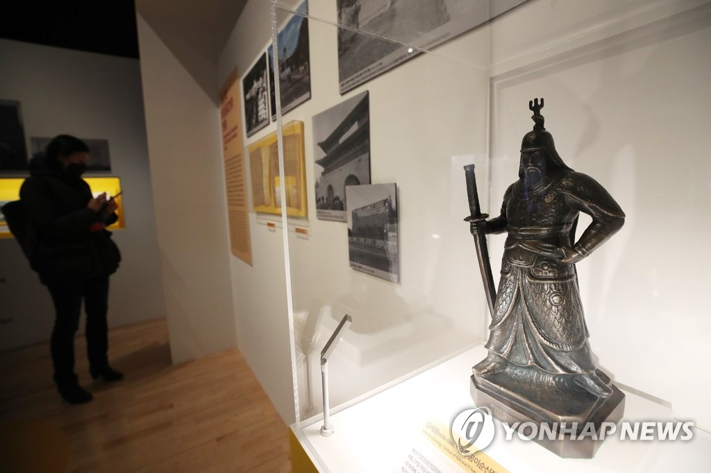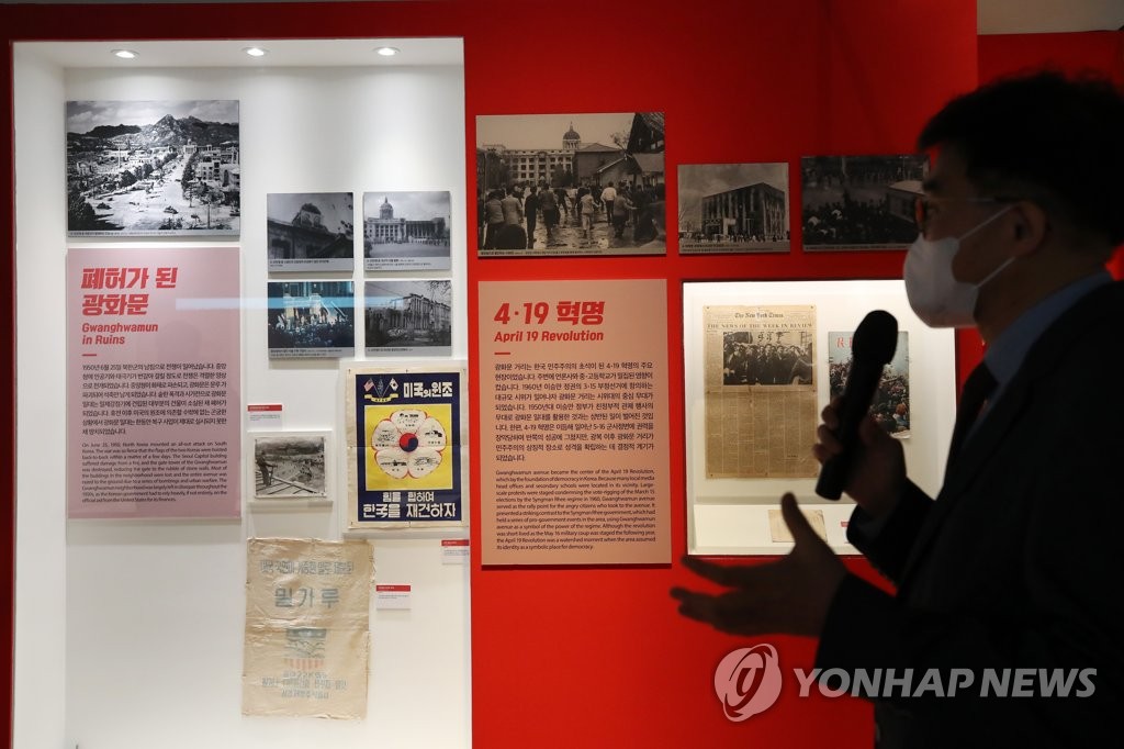 ▲ 한국 현대사의 현장 '광화문' (서울=연합뉴스) 강민지 기자 = 16일 오전 서울 종로구 대한민국역사박물관에서 열린 특별전 '공간으로 보는 한국 현대사, 광화문' 기자 간담회에서 김권정 학예연구사가 전시를 소개하고 있다.