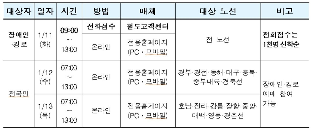 예매 대상은 1월 28일부터 2월 2일까지 6일간 운행하는 KTX·ITX-새마을·무궁화호 열차 등 승차권이다.