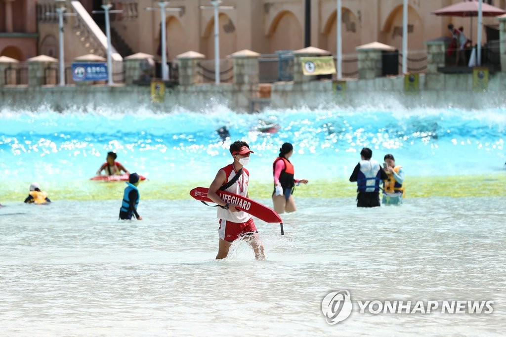 경남 김해에 있는 롯데워터파크를 찾은 방문객들도 파도 풀에 몸을 맡기고 물놀이를 즐겼다.