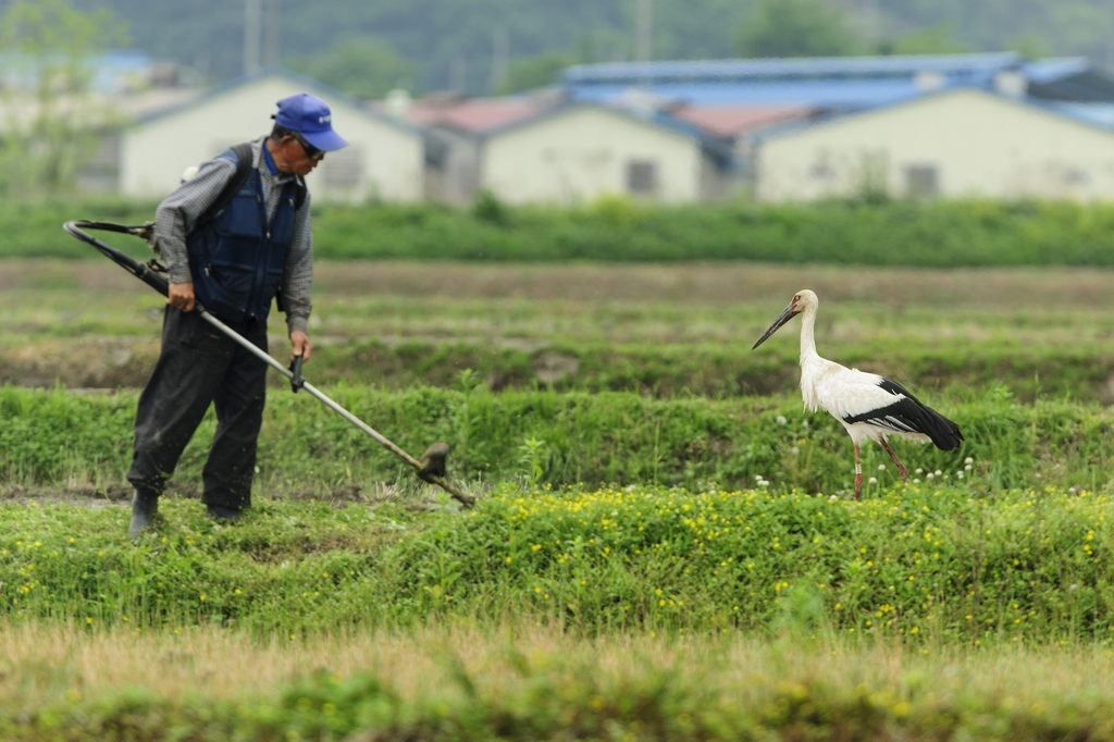 | ▲ 농민 곁에 날아온 황새 [사진작가 김경선 씨 제공. 재판매 및 DB 금지] |