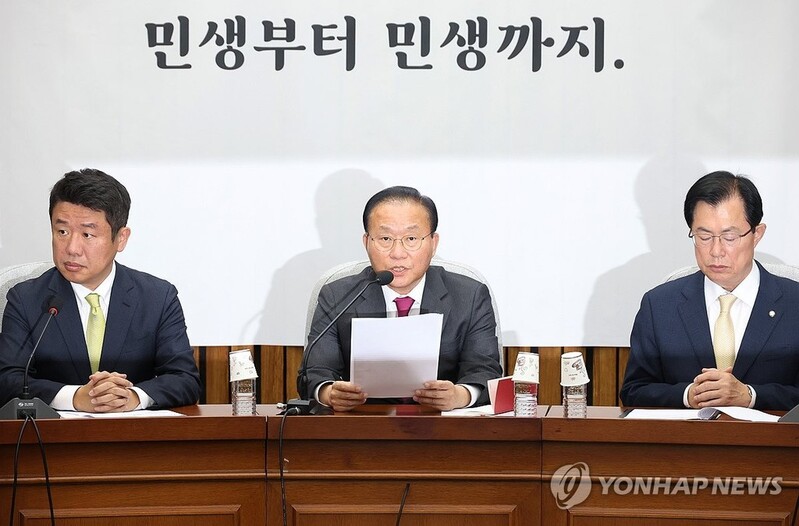 | ▲ Rep. Yun Jae-ok (C), floor leader of the ruling People Power Party, speaks at a party meeting at the National Assembly in Seoul on Oct. 31, 2023. (Yonhap) |