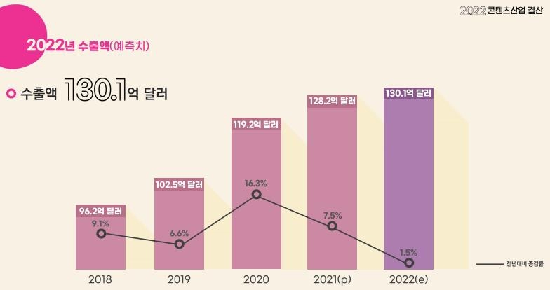 수출액은 지난 5년(2018~2022)간 꾸준히 증가했지만, 코로나19가 닥친 2020년 이후 전년 대비 증가율이 7.5%(2021), 1.5%(2022)로 하락세를 나타냈다. 이는 국내 콘텐츠 수출액의 70%를 차지하는 게임 산업 수출 감소가 영향을 미친 것으로 분석됐다.