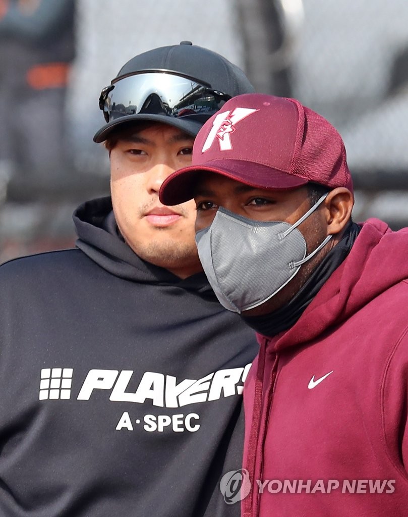 | ▲ 대전에서 만난 옛 동료 (대전=연합뉴스) 김준범 기자 = 4일 오전 대전 한화생명이글스파크에서 류현진(35·토론토 블루제이스)과 야시엘 푸이그(32·키움 히어로즈)가 만나 인사하고 있다. 2022.3.4 psykims@yna.co.kr |