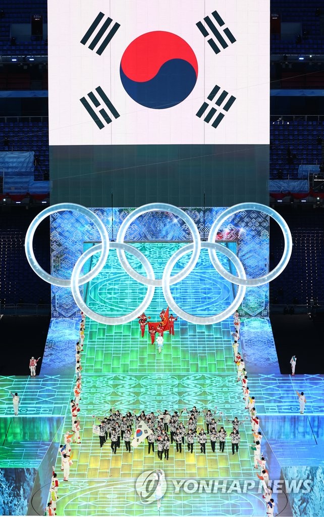 | ▲ [올림픽] 대한민국 선수단 입장 (베이징=연합뉴스) 김도훈 기자 = 4일 오후 중국 베이징 국립경기장에서 열린 2022 베이징 동계올림픽 개회식에서 대한민국 선수단이 입장하고 있다. 2022.2.5 superdoo82@yna.co.kr |