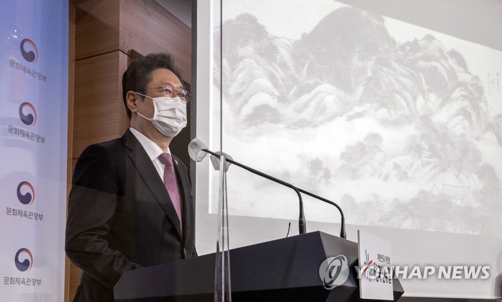 | ▲ 황희 장관, 고 이건희 삼성전자 회장 소장 문화재·미술품 기증 관련 브리핑 (서울=연합뉴스) 백승렬 기자 = 황희 문화체육관광부 장관이 28일 서울 종로구 정부서울청사 별관에서 고 이건희 삼성 회장 소장 문화재와 미술품 기증 관련 브리핑을 하고 있다.