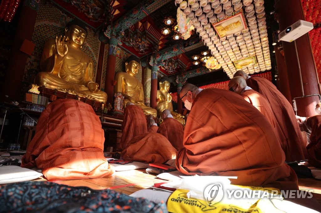 | ▲ 정청래 '통행세' 발언 성찰 기도 올리는 조계종 승려들 (서울=연합뉴스) 임화영 기자 = 조계종 승려들이 17일 오후 서울 종로구 조계사에서 문화재 관람료를 '통행세'라고 비판한 더불어민주당 정청래 의원의 발언에 대한 성찰 기도를 하고 있다. 정 의원은 지난달 국정감사에서 해인사 문화재 관람료를 통행세로 지칭하고 이를 걷는 사찰을 '봉이 김선달'에 비유, 불교계로부터 강한 항의를 받았다. 2021.11.17 hwayoung7@yna.co.kr |