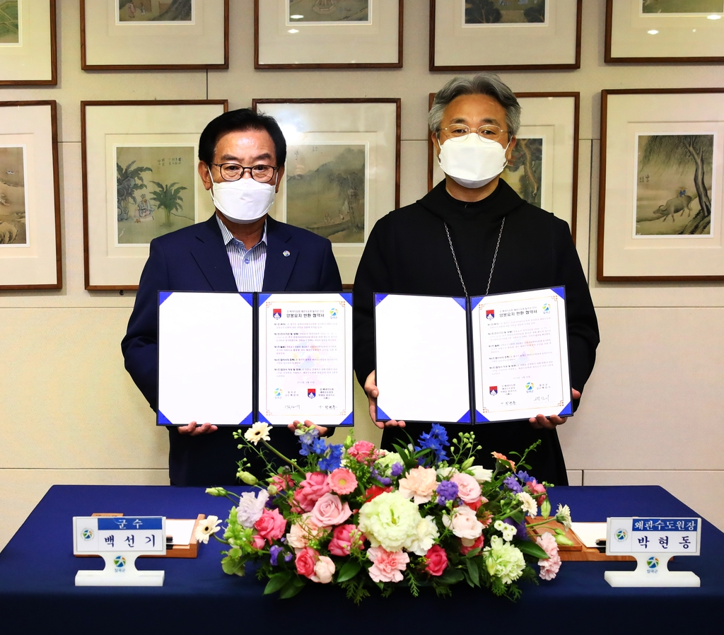 | ▲ 양봉요지 반환 협약식 백선기 칠곡군수(왼쪽)와 박현동 왜관수도원장이 양봉요지 협약식을 하고 있다. [칠곡군 제공. 재판매 및 DB 금지] |