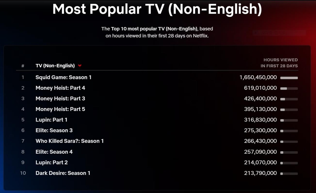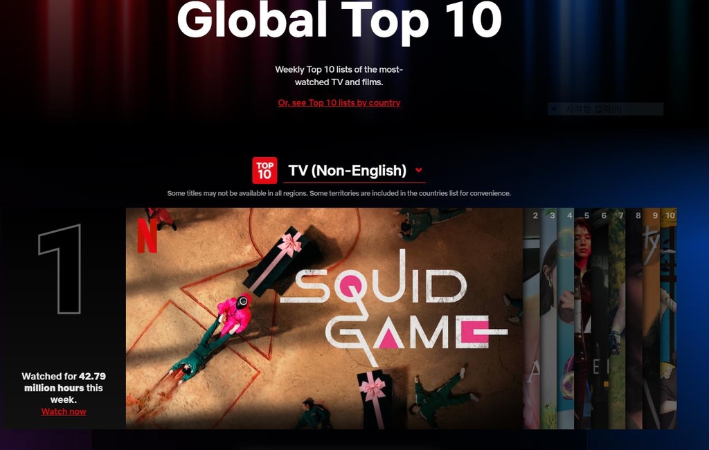 넷플릭스는 출시 후 28일(4주) 동안 가입자들이 시청한 시간을 기준으로 역대 히트작 순위를 매겼고 '오징어 게임'은 비영어권 드라마 중 16억5천45만 시간을 기록해 1위에 올랐다.
